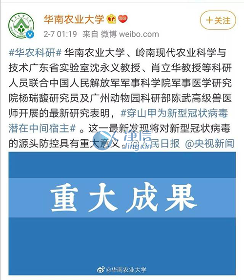 华南农业大学的沈永义和肖立华对比了穿山甲和新型冠状病毒感染者体内的基因样本,并结合其他研究结果,发现穿山甲可能是新型冠状病毒的潜在来源。两位研究人员在2月7日举行的新闻发布会上表示,二者序列之间的相似度高达99%。